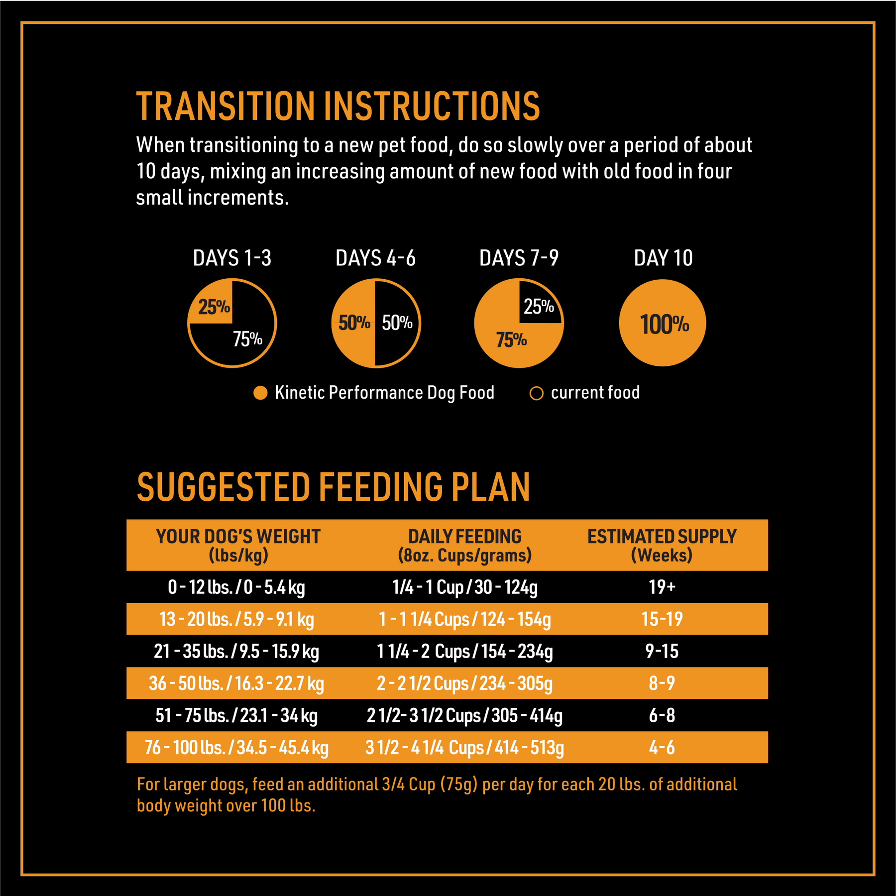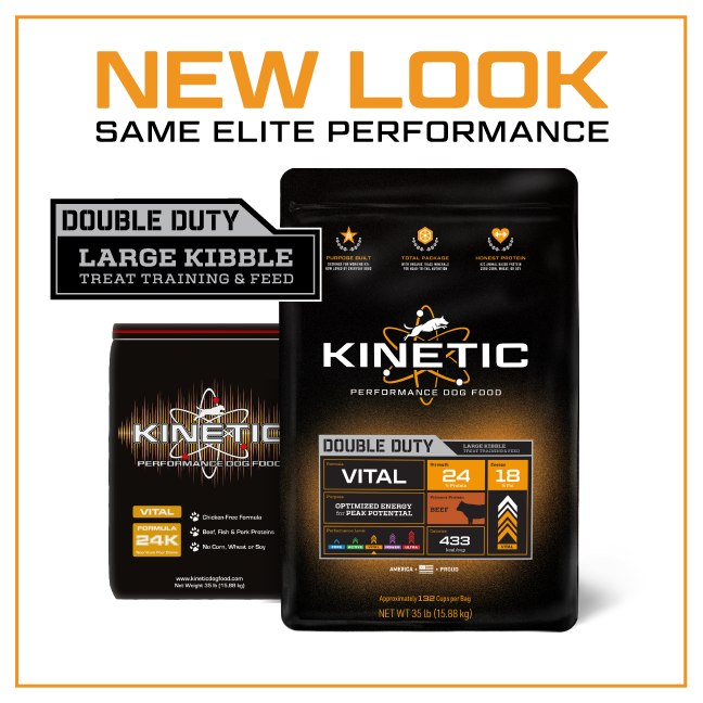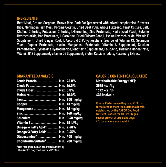 The Kinetic Vital 24K formula is a chicken-free performance dog food formula intended for dogs with frequent high activity levels that include periods of intense activity in 1-2 hour increments. This formula is also suitable for adult dogs that tend to maintain weight under normal conditions and small or medium breed puppies on fixed feeding programs.
